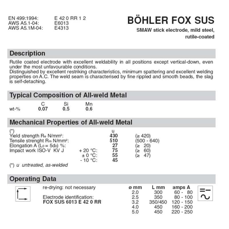 BÖHLER FOX SUS сварочный электрод с рутиловым покрытием. Подходит для применения во всех пространственных положениях, кроме вертикально сверху вниз.