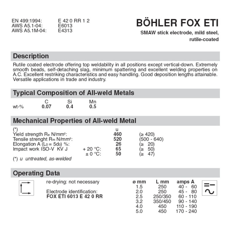 BÖHLER FOX ETI сварочный электрод с рутиловым покрытием. Подходит для применения во всех пространственных положениях, кроме вертикально сверху вниз.
