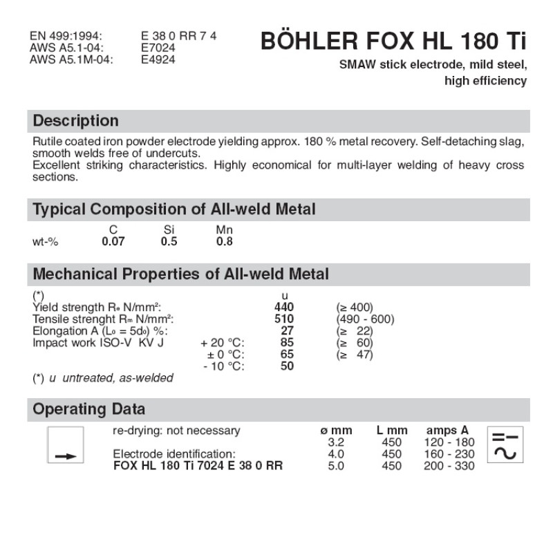 BÖHLER FOX HL 180 Ti сварочный электрод с рутиловым покрытием. Подходит для применения в горизонтальном нижнем положении.